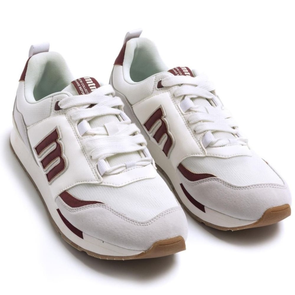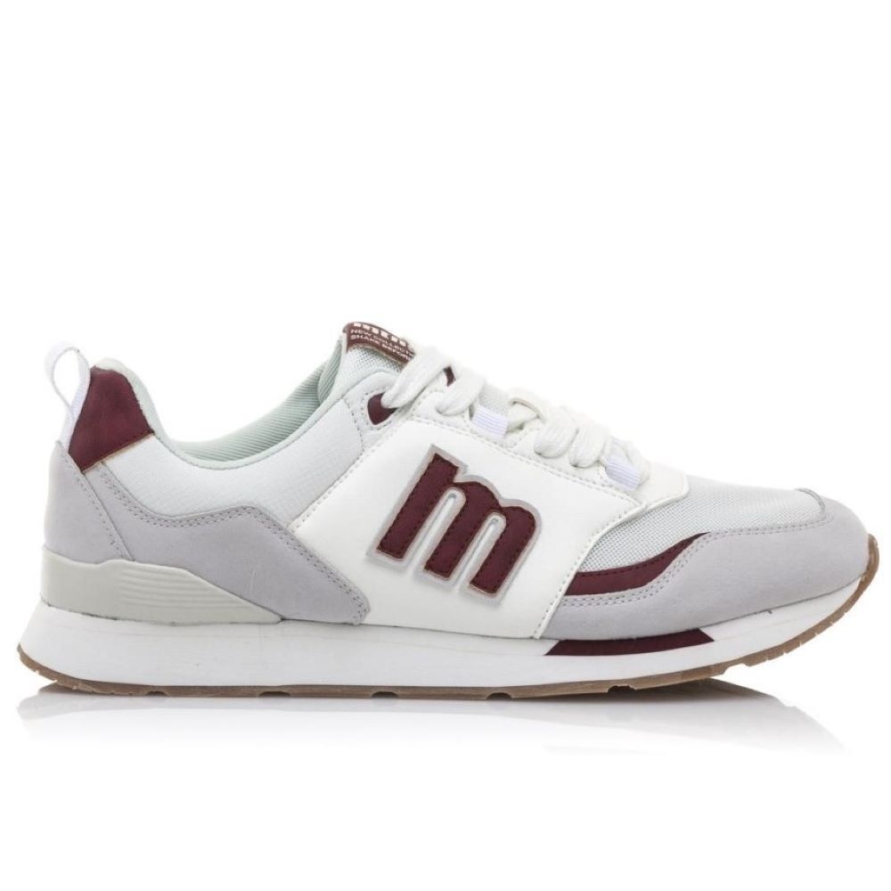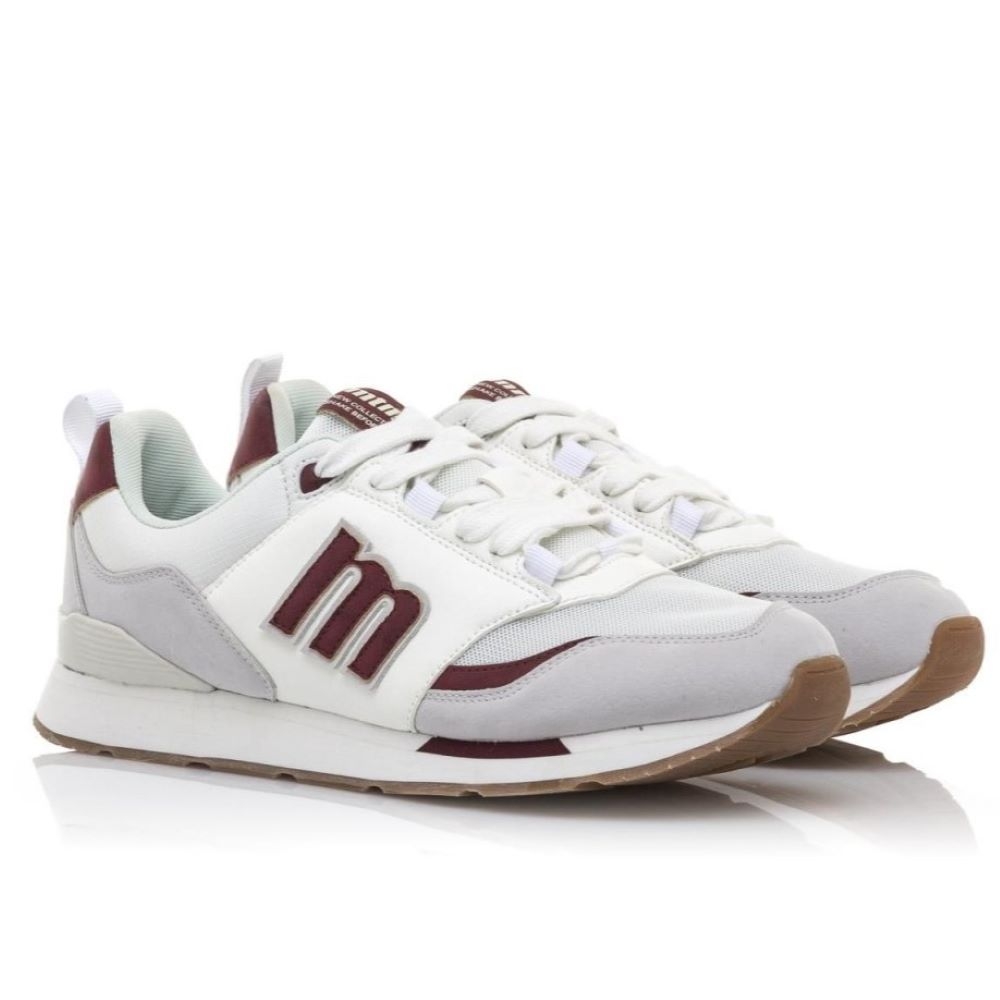 Zapatillas deportivas blancas de hombre, marca Mustang. Este modelo presenta un diseño moderno que incluye detalles en color burdeos. La M del logo de Mustang se encuentra boradada en el lateral. Perfecta para el uso diario. Estas zapatillas son ideales para un look casual. Conoce Loto Off White de Mustang para una opción versátil para tu día a día.